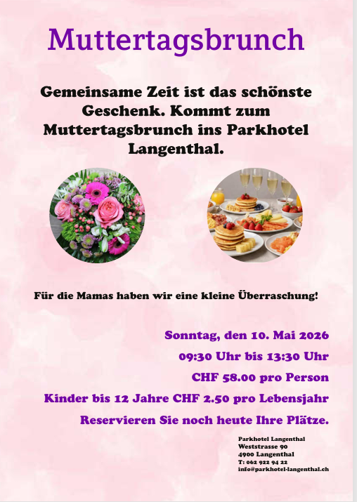 Tel: 062 922 94 22 oder E-Mail: info@parkhotel-langenthal.ch
